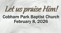 “Watching for Wolves” — February 8, 2026 February 8, 2026 Pastor Keith Williams I Thessalonians 2:1-8 Matthew 7:15-16a Cobham Park Baptist Church Warsaw VA Read View SHARE ON Twitter Facebook Buffer LinkedIn Pin It Leave a Reply Cancel replyYour email address will not be published. Required fields are marked *Comment * Name * Email * Website Δ Continue Reading “The Real Deal” — February 1, 2026 “Gospel Givens” — February 15, 2026